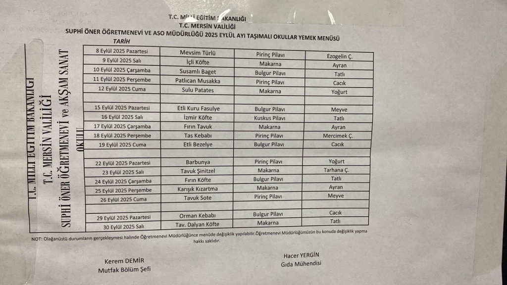 2025 EYLÜL AYI TAŞIMALI OKULLAR YEMEK MENÜSÜ